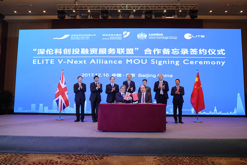 2017年12月16日,深圳证券交易所与伦敦证券交易所集团(以下分别简称深交所与伦交所)在北京共同举办中英创新资本专题研讨会暨“深伦科创投融资服务联盟”启动仪式。深交所下属深圳证券信息有限公司(以下简称深证信息)总经理王冰与伦交所旗下ELITE公司首席执行官 Luca Peyrano在合作备忘录上签字。