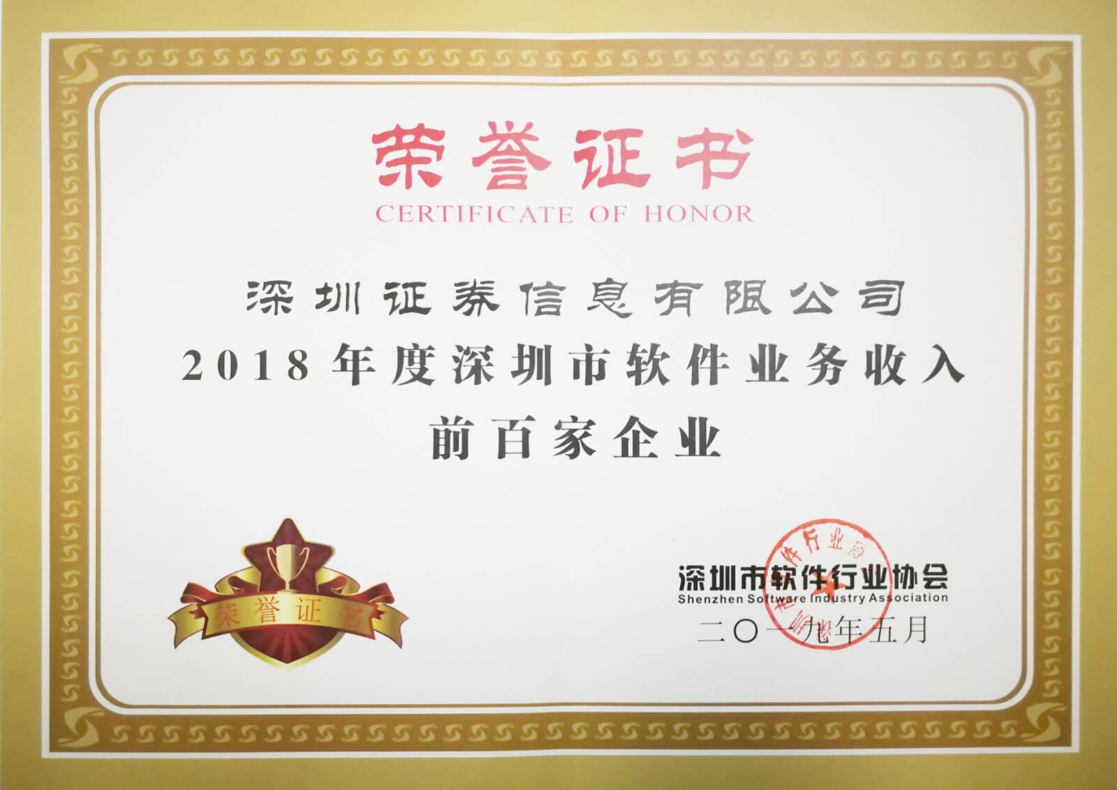 2019年5月,公司连续第9年获深圳市软件业务收入前百家企业荣誉。