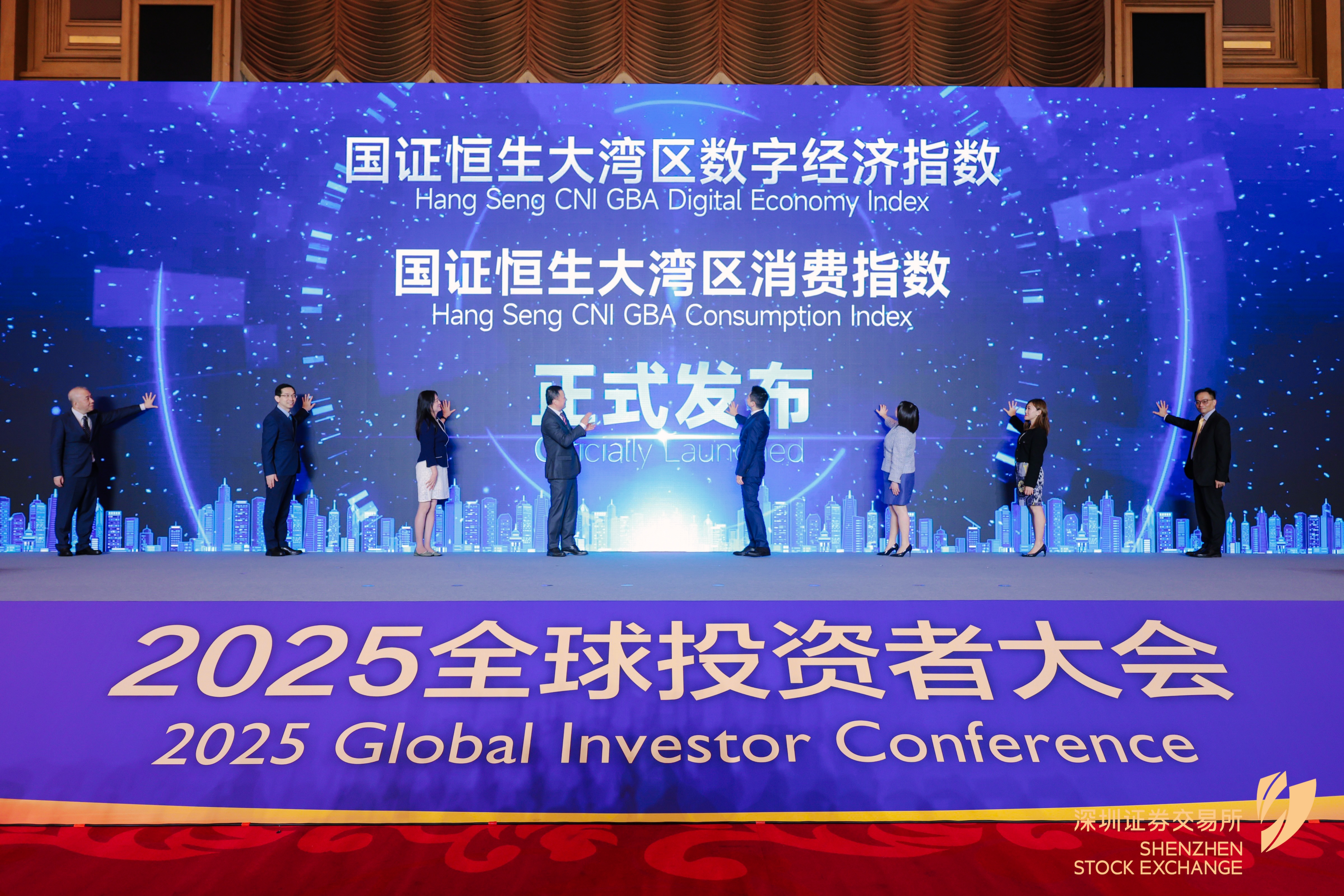 2025年5月19日,在深交所举办的2025年全球投资者大会上,公司联合恒生指数有限公司合作编制并联名发布国证恒生大湾区数字经济指数、国证恒生大湾区消费指数,以更好服务全球投资者跨境资产配置需求。深交所党委委员、副总经理李辉,公司党委书记、董事长周晖出席指数发布仪式。